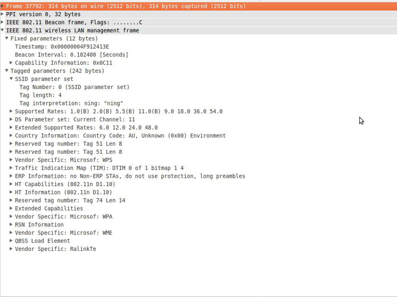 Our first experiments were conducted using wireshark and pycap. Here a screenshot of a beacon frame in wireshark: