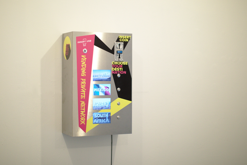 Vending Private Network takes the form of a condom vending machine, such as those typically seen in public toilets, nightclubs and bars. Equipped with mechanical buttons, a coin-slot and USB ports, it offers 4 VPN routes, each with an animated graphic depicting the route as a fantasy destination.